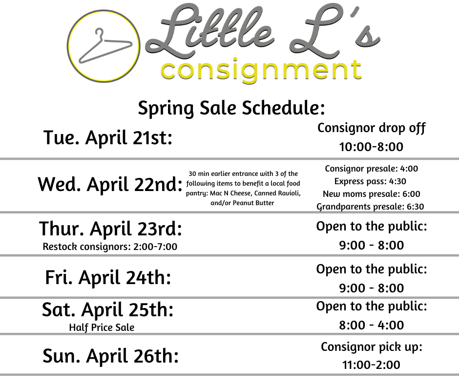 *No Children are allowed at pre-sale unless in a baby carrier attached to you. Little L's Consignment loves your sweet children but with limited space please make arrangements for children during the pre-sale and half price sale. *CHILDREN ARE WELCOME DURING ALL OTHER SALE HOURS*